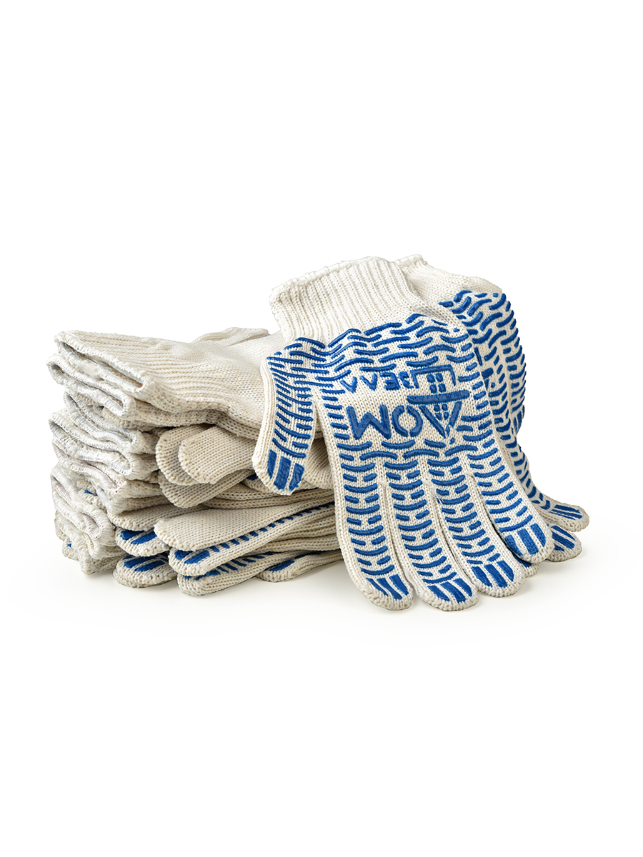 Материал дышащий, не вызывает аллергических pеакций. 10 класс вязки, 4 нити. ПВХ покрытие ладони в виде точек. Тип оверлока: автоматический, с использованием эластомерной нити.